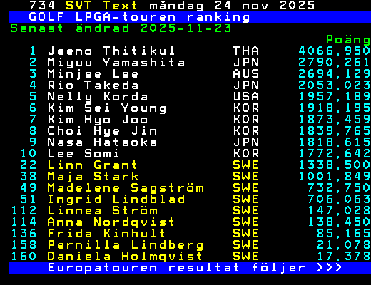 GOLF LPGA-touren ranking Senast ändrad 2025-11-23 Poäng 1 Jeeno Thitikul THA 4066,950 2 Miyuu Yamashita JPN 2790,261 3 Minjee Lee AUS 2694,129 4 Rio Takeda JPN 2053,023 5 Nelly Korda USA 1957,189 6 Kim Sei Young KOR 1918,195 7 Kim Hyo Joo KOR 1873,459 8 Choi Hye Jin KOR 1839,765 9 Nasa Hataoka JPN 1818,615 10 Lee Somi KOR 1772,642 22 Linn Grant SWE 1338,500 38 Maja Stark SWE 1001,849 49 Madelene Sagström SWE 732,750 51 Ingrid Lindblad SWE 706,063 112 Linnea Ström SWE 147,028 114 Anna Nordqvist SWE 138,450 136 Frida Kinhult SWE 85,165 158 Pernilla Lindberg SWE 21,078 160 Daniela Holmqvist SWE 17,378 Europatouren resultat följer >>> +Dela 10 dagar