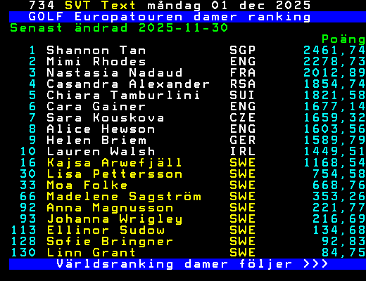 GOLF Europatouren damer ranking Senast ändrad 2025-11-30 Poäng 1 Shannon Tan SGP 2461,74 2 Mimi Rhodes ENG 2278,73 3 Nastasia Nadaud FRA 2012,89 4 Casandra Alexander RSA 1854,74 5 Chiara Tamburlini SUI 1821,58 6 Cara Gainer ENG 1677,14 7 Sara Kouskova CZE 1659,32 8 Alice Hewson ENG 1603,56 9 Helen Briem GER 1589,79 10 Lauren Walsh IRL 1449,51 16 Kajsa Arwefjäll SWE 1168,54 30 Lisa Pettersson SWE 754,58 33 Moa Folke SWE 668,76 66 Madelene Sagström SWE 353,26 92 Anna Magnusson SWE 221,77 93 Johanna Wrigley SWE 216,69 113 Ellinor Sudow SWE 134,68 128 Sofie Bringner SWE 92,83 130 Linn Grant SWE 84,75 Världsranking damer följer >>> +Dela 3 dagar