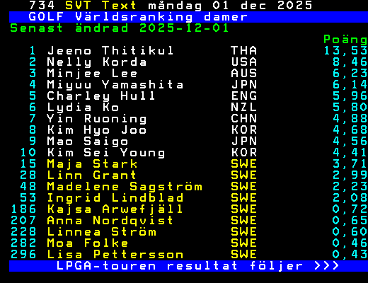 SVT Text Mån 01 Dec. 2025 GOLF Världsranking damer Senast ändrad 2025-12-01 Poäng 1 Jeeno Thitikul THA 13,53 2 Nelly Korda USA 8,46 3 Minjee Lee AUS 6,23 4 Miyuu Yamashita JPN 6,14 5 Charley Hull ENG 5,96 6 Lydia Ko NZL 5,80 7 Yin Ruoning CHN 4,88 8 Kim Hyo Joo KOR 4,68 9 Mao Saigo JPN 4,56 10 Kim Sei Young KOR 4,41 15 Maja Stark SWE 3,71 28 Linn Grant SWE 2,99 48 Madelene Sagström SWE 2,23 53 Ingrid Lindblad SWE 2,08 186 Kajsa Arwefjäll SWE 0,72 207 Anna Nordqvist SWE 0,65 228 Linnea Ström SWE 0,60 282 Moa Folke SWE 0,46 296 Lisa Pettersson SWE 0,43 LPGA-touren resultat följer >>> +Dela 2 dagar