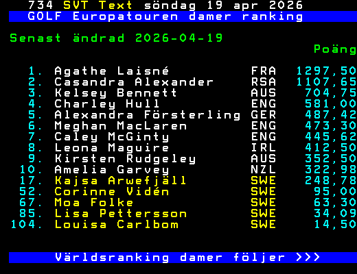 GOLF Europatouren damer ranking Senast ändrad 2026-04-19 Poäng 1. Agathe Laisné FRA 1297,50 2. Casandra Alexander RSA 1107,65 3. Kelsey Bennett AUS 704,75 4. Charley Hull ENG 581,00 5. Alexandra Försterling GER 487,42 6. Meghan MacLaren ENG 473,30 7. Caley McGinty ENG 445,62 8. Leona Maguire IRL 412,50 9. Kirsten Rudgeley AUS 352,50 10. Amelia Garvey NZL 322,98 17. Kajsa Arwefjäll SWE 248,78 52. Corinne Vidén SWE 95,00 67. Moa Folke SWE 63,30 85. Lisa Pettersson SWE 34,09 104. Louisa Carlbom SWE 14,50 Världsranking damer följer >>> +Dela 3 dagar