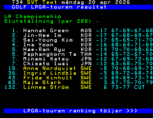 GOLF LPGA-touren resultat LA Championship Slutställning (par 288) : 1. Hannah Green AUS -17 67-69-67-68 2. Jin-Hee Im KOR -17 67-68-69-67 2. Sei-Young Kim KOR -17 65-65-71-70 4. Ina Yoon KOR -16 68-64-71-69 5. Hae-Ran Ryu KOR -14 70-70-68-66 5. Paphangkorn Ta THA -14 65-72-67-70 7. Minami Katsu JPN -12 67-69-72-68 7. Chisato Iwai JPN -12 63-68-75-70 18. Anna Nordqvist SWE -8 70-68-69-73 36. Ingrid Lindbla SWE -5 69-72-68-74 43. Frida Kinhult SWE -3 69-69-73-74 63. Maja Stark SWE 3 67-75-70-79 132. Linnea Ström SWE 6 73-77 CUT LPGA-touren ranking följer >>> +Dela 3 dagar