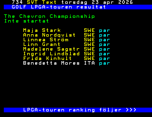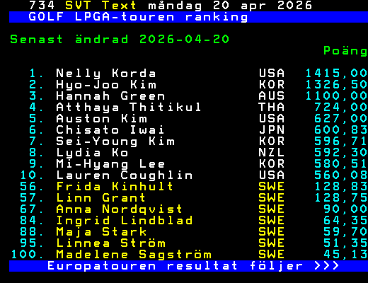GOLF LPGA-touren ranking Senast ändrad 2026-04-20 Poäng 1. Nelly Korda USA 1415,00 2. Hyo-Joo Kim KOR 1326,50 3. Hannah Green AUS 1100,00 4. Atthaya Thitikul THA 724,00 5. Auston Kim USA 627,00 6. Chisato Iwai JPN 600,83 7. Sei-Young Kim KOR 596,71 8. Lydia Ko NZL 592,30 9. Mi-Hyang Lee KOR 580,51 10. Lauren Coughlin USA 560,08 56. Frida Kinhult SWE 128,83 57. Linn Grant SWE 128,75 67. Anna Nordqvist SWE 90,00 84. Ingrid Lindblad SWE 64,35 88. Maja Stark SWE 59,70 95. Linnea Ström SWE 51,35 100. Madelene Sagström SWE 45,13 Europatouren resultat följer >>> +Dela 3 dagar