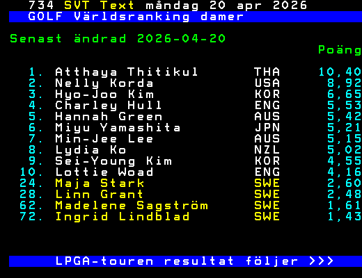 SVT Text Mån 20 Apr. 2026 GOLF Världsranking damer Senast ändrad 2026-04-20 Poäng 1. Atthaya Thitikul THA 10,40 2. Nelly Korda USA 8,92 3. Hyo-Joo Kim KOR 6,65 4. Charley Hull ENG 5,53 5. Hannah Green AUS 5,42 6. Miyu Yamashita JPN 5,21 7. Min-Jee Lee AUS 5,15 8. Lydia Ko NZL 5,02 9. Sei-Young Kim KOR 4,55 10. Lottie Woad ENG 4,16 24. Maja Stark SWE 2,60 28. Linn Grant SWE 2,48 62. Madelene Sagström SWE 1,61 72. Ingrid Lindblad SWE 1,43 LPGA-touren resultat följer >>> +Dela 2 dagar