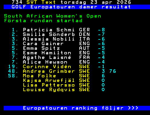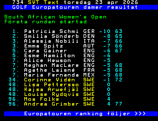 GOLF Europatouren damer resultat South African Women's Open Första rundan startad 1. Patricia Schmi GER -8 2. Smilla Sönderb DEN -7 3. Alessia Nobili ITA -6 3. Cara Gainer ENG -6 5. Emma Spitz AUT -5 5. Esme Hamilton ENG -5 7. Agathe Laisné FRA -4 7. Alice Hewson ENG -4 19. Corinne Vidén SWE -1 48. Andrea Grimber SWE 3 76 58. Moa Folke SWE 6 Kajsa Arwefjäl SWE 0 Lisa Pettersso SWE 0 Louise Rydqvis SWE 0 Europatouren ranking följer >>> +Dela 11:45