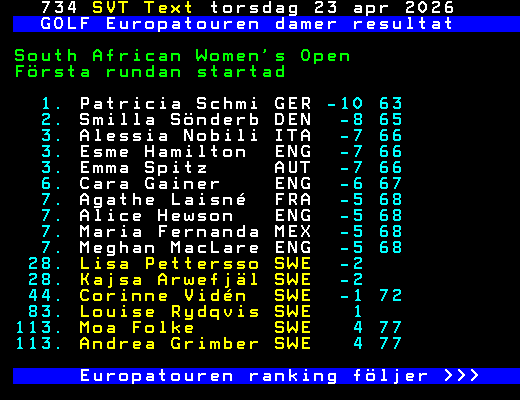 GOLF Europatouren damer resultat South African Women's Open Första rundan startad 1. Patricia Schmi GER -10 63 2. Smilla Sönderb DEN -8 65 3. Alessia Nobili ITA -7 66 3. Esme Hamilton ENG -7 66 3. Emma Spitz AUT -7 66 6. Cara Gainer ENG -6 67 7. Agathe Laisné FRA -5 68 7. Alice Hewson ENG -5 68 7. Maria Fernanda MEX -5 68 7. Meghan MacLare ENG -5 68 28. Lisa Pettersso SWE -2 28. Kajsa Arwefjäl SWE -2 44. Corinne Vidén SWE -1 72 83. Louise Rydqvis SWE 1 113. Moa Folke SWE 4 77 113. Andrea Grimber SWE 4 77 Europatouren ranking följer >>> +Dela 14:35