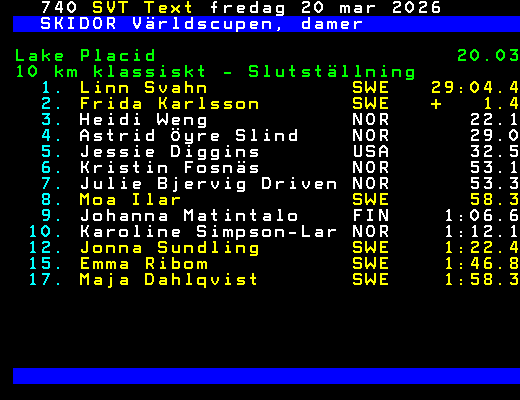 SKIDOR Världscupen, damer Lake Placid 20.03 10 km klassiskt - Slutställning 1. Linn Svahn SWE 29:04.4 2. Frida Karlsson SWE + 1.4 3. Heidi Weng NOR 22.1 4. Astrid Öyre Slind NOR 29.0 5. Jessie Diggins USA 32.5 6. Kristin Fosnäs NOR 53.1 7. Julie Bjervig Driven NOR 53.3 8. Moa Ilar SWE 58.3 9. Johanna Matintalo FIN 1:06.6 10. Karoline Simpson-Lar NOR 1:12.1 12. Jonna Sundling SWE 1:22.4 15. Emma Ribom SWE 1:46.8 17. Maja Dahlqvist SWE 1:58.3 +Dela 33 dagar
