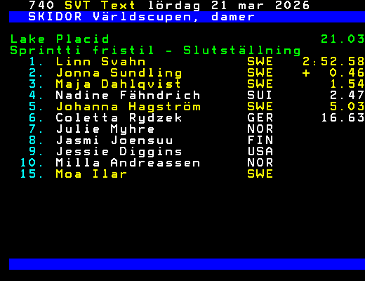 SKIDOR Världscupen, damer Lake Placid 21.03 Sprintti fristil - Slutställning 1. Linn Svahn SWE 2:52.58 2. Jonna Sundling SWE + 0.46 3. Maja Dahlqvist SWE 1.54 4. Nadine Fähndrich SUI 2.47 5. Johanna Hagström SWE 5.03 6. Coletta Rydzek GER 16.63 7. Julie Myhre NOR 8. Jasmi Joensuu FIN 9. Jessie Diggins USA 10. Milla Andreassen NOR 15. Moa Ilar SWE +Dela 32 dagar