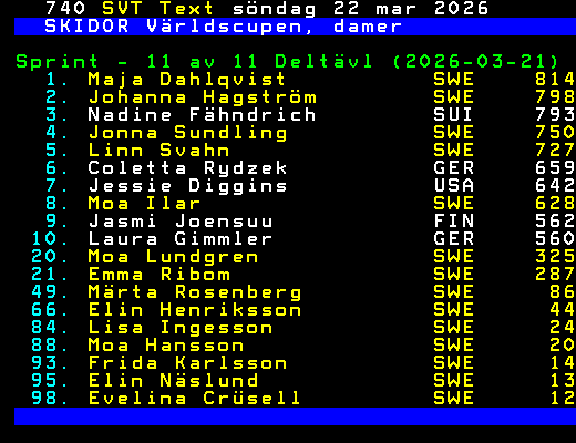 SKIDOR Världscupen, damer Sprint - 11 av 11 Deltävl (2026-03-21) 1. Maja Dahlqvist SWE 814 2. Johanna Hagström SWE 798 3. Nadine Fähndrich SUI 793 4. Jonna Sundling SWE 750 5. Linn Svahn SWE 727 6. Coletta Rydzek GER 659 7. Jessie Diggins USA 642 8. Moa Ilar SWE 628 9. Jasmi Joensuu FIN 562 10. Laura Gimmler GER 560 20. Moa Lundgren SWE 325 21. Emma Ribom SWE 287 49. Märta Rosenberg SWE 86 66. Elin Henriksson SWE 44 84. Lisa Ingesson SWE 24 88. Moa Hansson SWE 20 93. Frida Karlsson SWE 14 95. Elin Näslund SWE 13 98. Evelina Crüsell SWE 12 +Dela 32 dagar