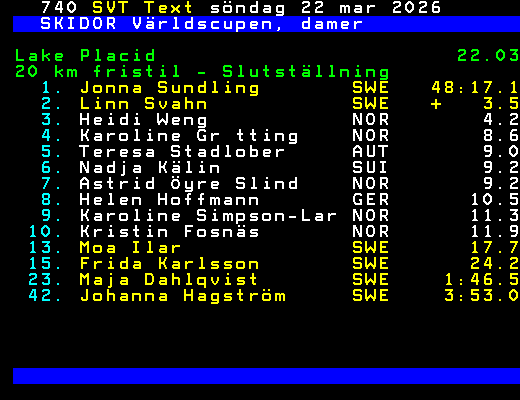SVT Text Sön 22 Mars 2026 SKIDOR Världscupen, damer Lake Placid 22.03 20 km fristil - Slutställning 1. Jonna Sundling SWE 48:17.1 2. Linn Svahn SWE + 3.5 3. Heidi Weng NOR 4.2 4. Karoline Gr tting NOR 8.6 5. Teresa Stadlober AUT 9.0 6. Nadja Kälin SUI 9.2 7. Astrid Öyre Slind NOR 9.2 8. Helen Hoffmann GER 10.5 9. Karoline Simpson-Lar NOR 11.3 10. Kristin Fosnäs NOR 11.9 13. Moa Ilar SWE 17.7 15. Frida Karlsson SWE 24.2 23. Maja Dahlqvist SWE 1:46.5 42. Johanna Hagström SWE 3:53.0 +Dela 31 dagar
