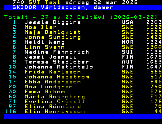 SKIDOR Världscupen, damer Totalt - 27 av 27 Deltävl (2026-03-22) 1. Jessie Diggins USA 2303 2. Moa Ilar SWE 1922 3. Maja Dahlqvist SWE 1623 4. Jonna Sundling SWE 1422 5. Heidi Weng NOR 1324 6. Linn Svahn SWE 1300 7. Nadine Fähndrich SUI 1135 8. Jasmi Joensuu FIN 1079 9. Teresa Stadlober AUT 1063 10. Johanna Matintalo FIN 1047 14. Frida Karlsson SWE 965 15. Johanna Hagström SWE 917 17. Ebba Andersson SWE 845 20. Moa Lundgren SWE 790 30. Emma Ribom SWE 578 60. Märta Rosenberg SWE 213 71. Evelina Crüsell SWE 176 97. Elina Rönnlund SWE 70 116. Elin Henriksson SWE 44 +Dela 31 dagar