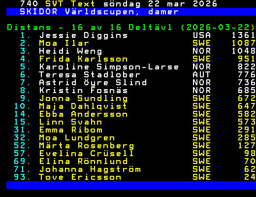 SKIDOR Världscupen, damer Distans - 16 av 16 Deltävl (2026-03-22) 1. Jessie Diggins USA 1361 2. Moa Ilar SWE 1087 3. Heidi Weng NOR 1048 4. Frida Karlsson SWE 951 5. Karoline Simpson-Larse NOR 822 6. Teresa Stadlober AUT 776 7. Astrid Öyre Slind NOR 736 8. Kristin Fosnäs NOR 685 9. Jonna Sundling SWE 672 10. Maja Dahlqvist SWE 647 14. Ebba Andersson SWE 582 15. Linn Svahn SWE 573 31. Emma Ribom SWE 291 32. Moa Lundgren SWE 285 52. Märta Rosenberg SWE 127 57. Evelina Crüsell SWE 98 69. Elina Rönnlund SWE 70 71. Johanna Hagström SWE 62 93. Tove Ericsson SWE 24 +Dela 31 dagar