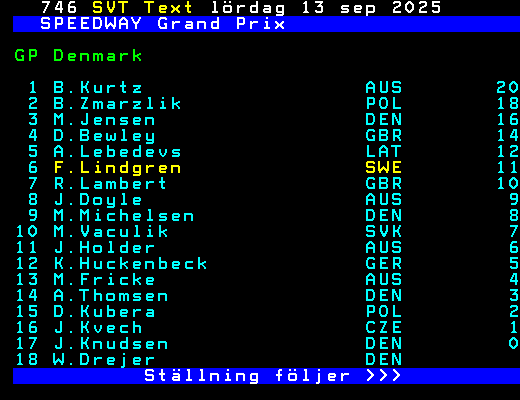 SPEEDWAY Grand Prix GP Denmark 1 B.Kurtz AUS 20 2 B.Zmarzlik POL 18 3 M.Jensen DEN 16 4 D.Bewley GBR 14 5 A.Lebedevs LAT 12 6 F.Lindgren SWE 11 7 R.Lambert GBR 10 8 J.Doyle AUS 9 9 M.Michelsen DEN 8 10 M.Vaculik SVK 7 11 J.Holder AUS 6 12 K.Huckenbeck GER 5 13 M.Fricke AUS 4 14 A.Thomsen DEN 3 15 D.Kubera POL 2 16 J.Kvech CZE 1 17 J.Knudsen DEN 0 18 W.Drejer DEN Ställning följer >>> +Dela 81 dagar