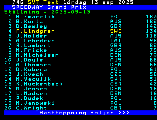 SPEEDWAY Grand Prix Ställning - 2025-09-13 1 B.Zmarzlik POL 183 2 B.Kurtz AUS 182 3 D.Bewley GBR 142 4 F.Lindgren SWE 134 5 J.Holder AUS 118 6 A.Lebedevs LAT 98 7 R.Lambert GBR 82 8 M.Fricke AUS 79 9 M.Michelsen DEN 70 10 J.Doyle AUS 66 11 A.Thomsen DEN 66 12 D.Kubera POL 61 13 J.Kvech CZE 58 14 M.Vaculik SVK 51 15 K.Huckenbeck GER 42 16 M.Jensen DEN 16 17 L.Madsen DEN 16 18 P.Dudek POL 16 19 M.Janowski POL 8 20 C.Wright GBR 7 Hästhoppning följer >>> +Dela 81 dagar