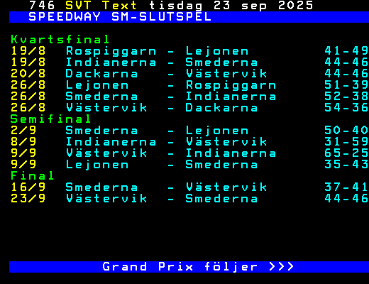 SVT Text Tis 23 Sep. 2025 SPEEDWAY SM-SLUTSPEL Kvartsfinal 19/8 Rospiggarn - Lejonen 41-49 19/8 Indianerna - Smederna 44-46 20/8 Dackarna - Västervik 44-46 26/8 Lejonen - Rospiggarn 51-39 26/8 Smederna - Indianerna 52-38 26/8 Västervik - Dackarna 54-36 Semifinal 2/9 Smederna - Lejonen 50-40 8/9 Indianerna - Västervik 31-59 9/9 Västervik - Indianerna 65-25 9/9 Lejonen - Smederna 35-43 Final 16/9 Smederna - Västervik 37-41 23/9 Västervik - Smederna 44-46 Grand Prix följer >>> +Dela 71 dagar