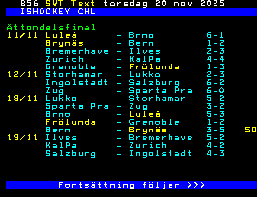 SVT Text Tors 20 Nov. 2025 ISHOCKEY CHL Åttondelsfinal 11/11 Luleå - Brno 6-1 Brynäs - Bern 1-2 Bremerhave - Ilves 2-3 Zurich - KalPa 4-4 Grenoble - Frölunda 1-3 12/11 Storhamar - Lukko 2-3 Ingolstadt - Salzburg 6-2 Zug - Sparta Pra 6-0 18/11 Lukko - Storhamar 5-2 Sparta Pra - Zug 3-2 Brno - Luleå 5-3 Frölunda - Grenoble 1-2 Bern - Brynäs 3-5 SD 19/11 Ilves - Bremerhave 5-2 KalPa - Zurich 4-2 Salzburg - Ingolstadt 4-3 Fortsättning följer >>> +Dela 14 dagar
