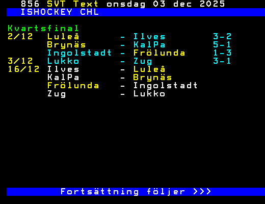 ISHOCKEY CHL Kvartsfinal 2/12 Luleå - Ilves 3-2 Brynäs - KalPa 5-1 Ingolstadt - Frölunda 1-3 3/12 Lukko - Zug 3-1 16/12 Ilves - Luleå KalPa - Brynäs Frölunda - Ingolstadt Zug - Lukko Fortsättning följer >>> +Dela Igår 19:51