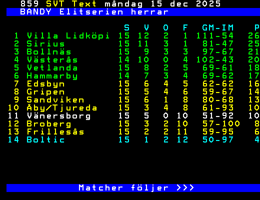 BANDY Elitserien herrar S V O F GM-IM P 1 Villa Lidköpi 15 12 2 1 111-54 26 2 Sirius 15 11 3 1 81-47 25 3 Bollnäs 15 9 3 3 97-67 21 4 Västerås 14 10 0 4 102-43 20 5 Vetlanda 15 8 2 5 69-61 18 6 Hammarby 14 7 3 4 69-62 17 7 Edsbyn 15 6 4 5 62-62 16 8 Gripen 15 5 4 6 59-67 14 9 Sandviken 15 6 1 8 80-68 13 10 Åby/Tjureda 15 3 4 8 61-93 10 11 Vänersborg 15 5 0 10 51-92 10 12 Broberg 15 3 2 10 57-100 8 13 Frillesås 15 2 2 11 59-95 6 14 Boltic 15 1 2 12 50-97 4 Matcher följer >>> +Dela 128 dagar