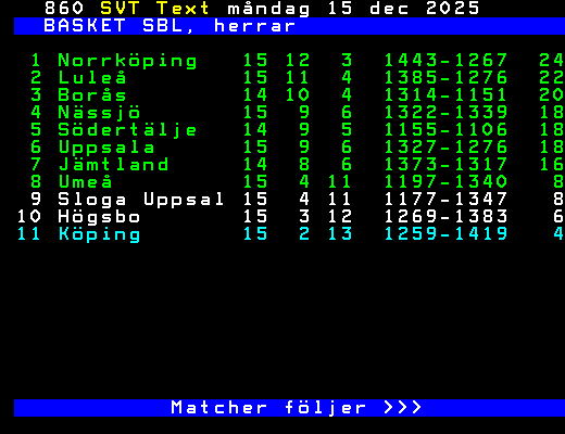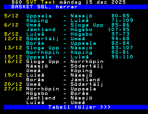 SVT Text Mån 15 Dec. 2025 BASKET SBL, herrar 5/12 Uppsala - Nässjö 80-85 Köping - Luleå 71-109 6/12 Umeå - Sloga Upp 85-86 Jämtland - Högsbo 107-95 8/12 Luleå - Högsbo 97-73 12/12 Södertälj - Umeå 94-68 Borås - Uppsala 82-84 13/12 Sloga Upp - Nässjö 83-107 Norrköpin - Köping 92-81 15/12 Uppsala - Luleå 95-110 16/12 Sloga Upp - Norrköpin Nässjö - Södertälj Umeå - Köping 19/12 Luleå - Nässjö Borås - Jämtland 20/12 Umeå - Södertälj 27/12 Norrköpin - Uppsala Högsbo - Borås Jämtland - Nässjö Luleå - Umeå Tabell följer >>> +Dela 128 dagar