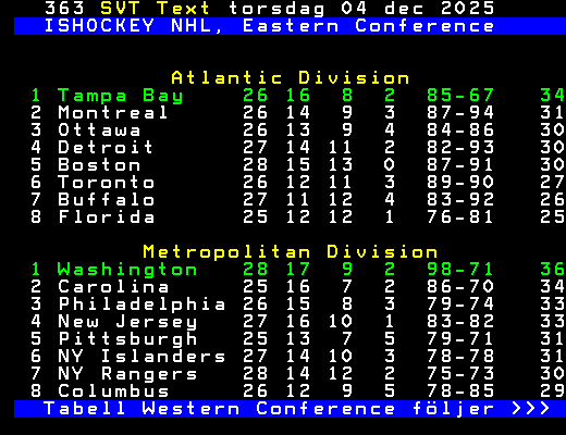 ISHOCKEY NHL, Eastern Conference Atlantic Division 1 Tampa Bay 26 16 8 2 85-67 34 2 Montreal 26 14 9 3 87-94 31 3 Ottawa 26 13 9 4 84-86 30 4 Detroit 27 14 11 2 82-93 30 5 Boston 28 15 13 0 87-91 30 6 Toronto 26 12 11 3 89-90 27 7 Buffalo 27 11 12 4 83-92 26 8 Florida 25 12 12 1 76-81 25 Metropolitan Division 1 Washington 28 17 9 2 98-71 36 2 Carolina 25 16 7 2 86-70 34 3 Philadelphia 26 15 8 3 79-74 33 4 New Jersey 27 16 10 1 83-82 33 5 Pittsburgh 25 13 7 5 79-71 31 6 NY Islanders 27 14 10 3 78-78 31 7 NY Rangers 28 14 12 2 75-73 30 8 Columbus 26 12 9 5 78-85 29 Tabell Western Conference följer >>> +Dela 06:50