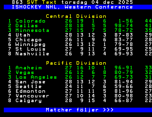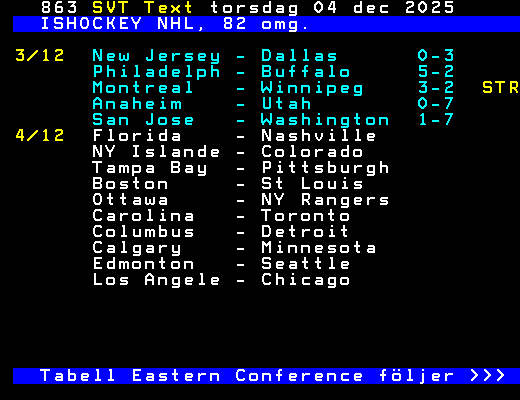 SVT Text Tors 04 Dec. 2025 ISHOCKEY NHL, 82 omg. 3/12 New Jersey - Dallas 0-3 Philadelph - Buffalo 5-2 Montreal - Winnipeg 3-2 STR Anaheim - Utah 0-7 San Jose - Washington 1-7 4/12 Florida - Nashville NY Islande - Colorado Tampa Bay - Pittsburgh Boston - St Louis Ottawa - NY Rangers Carolina - Toronto Columbus - Detroit Calgary - Minnesota Edmonton - Seattle Los Angele - Chicago Tabell Eastern Conference följer >>> +Dela 07:01