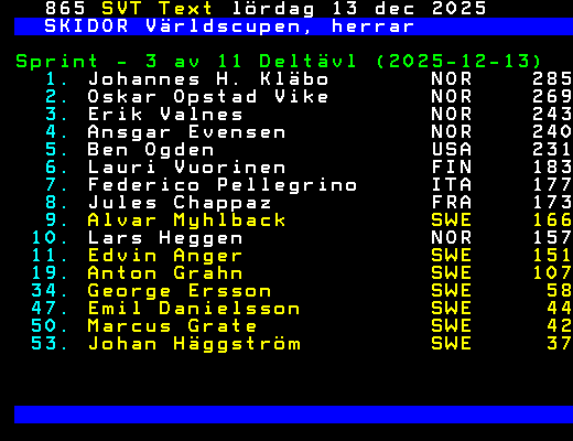 SKIDOR Världscupen, herrar Sprint - 3 av 11 Deltävl (2025-12-13) 1. Johannes H. Kläbo NOR 285 2. Oskar Opstad Vike NOR 269 3. Erik Valnes NOR 243 4. Ansgar Evensen NOR 240 5. Ben Ogden USA 231 6. Lauri Vuorinen FIN 183 7. Federico Pellegrino ITA 177 8. Jules Chappaz FRA 173 9. Alvar Myhlback SWE 166 10. Lars Heggen NOR 157 11. Edvin Anger SWE 151 19. Anton Grahn SWE 107 34. George Ersson SWE 58 47. Emil Danielsson SWE 44 50. Marcus Grate SWE 42 53. Johan Häggström SWE 37 +Dela 130 dagar
