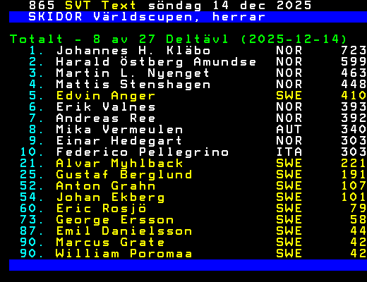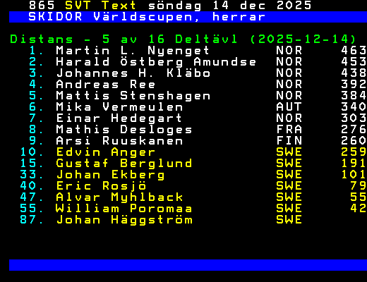 SKIDOR Världscupen, herrar Distans - 5 av 16 Deltävl (2025-12-14) 1. Martin L. Nyenget NOR 463 2. Harald Östberg Amundse NOR 453 3. Johannes H. Kläbo NOR 438 4. Andreas Ree NOR 392 5. Mattis Stenshagen NOR 384 6. Mika Vermeulen AUT 340 7. Einar Hedegart NOR 303 8. Mathis Desloges FRA 276 9. Arsi Ruuskanen FIN 260 10. Edvin Anger SWE 259 15. Gustaf Berglund SWE 191 33. Johan Ekberg SWE 101 40. Eric Rosjö SWE 79 47. Alvar Myhlback SWE 55 55. William Poromaa SWE 42 87. Johan Häggström SWE +Dela 130 dagar