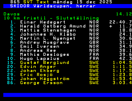 SVT Text Mån 15 Dec. 2025 SKIDOR Världscupen, herrar Davos 14.12 10 km fristil - Slutställning 1. Einar Hedegart NOR 22:40.7 2. Harald Östberg Amund NOR + 11.7 3. Mattis Stenshagen NOR 18.8 4. Johannes H. Kläbo NOR 24.1 5. Martin L. Nyenget NOR 30.6 6. Andrew Musgrave GBR 31.1 7. Emil Iversen NOR 34.9 8. Andreas Ree NOR 38.1 9. Mathis Desloges FRA 39.6 10. Hugo Lapalus FRA 42.3 15. Gustaf Berglund SWE 1:04.5 20. Edvin Anger SWE 1:11.5 22. Johan Ekberg SWE 1:17.5 29. Eric Rosjö SWE 1:23.8 53. Johan Häggström SWE 1:53.4 86. George Ersson SWE 3:03.4 +Dela 129 dagar