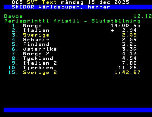 SKIDOR Världscupen, herrar Davos 12.12 Parisprintti fristil - Slutställning 1. Norge 14:00.95 2. Italien + 2.04 3. Sverige 2.09 4. Schweiz 2.59 5. Finland 3.21 6. Österrike 3.30 7. Norge 2 4.13 8. Tyskland 4.54 9. Italien 2 7.88 10. Tjeckien 11.26 15. Sverige 2 1:42.87 +Dela 129 dagar