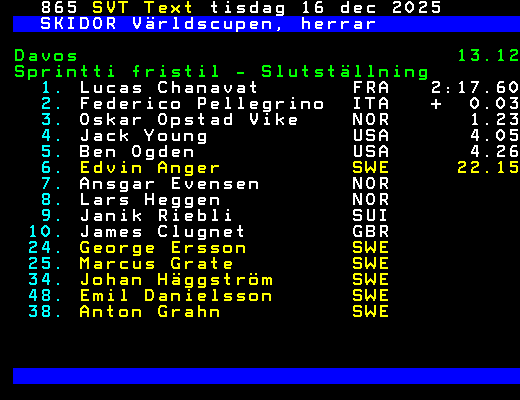 SKIDOR Världscupen, herrar Davos 13.12 Sprintti fristil - Slutställning 1. Lucas Chanavat FRA 2:17.60 2. Federico Pellegrino ITA + 0.03 3. Oskar Opstad Vike NOR 1.23 4. Jack Young USA 4.05 5. Ben Ogden USA 4.26 6. Edvin Anger SWE 22.15 7. Ansgar Evensen NOR 8. Lars Heggen NOR 9. Janik Riebli SUI 10. James Clugnet GBR 24. George Ersson SWE 25. Marcus Grate SWE 34. Johan Häggström SWE 48. Emil Danielsson SWE 38. Anton Grahn SWE +Dela 128 dagar