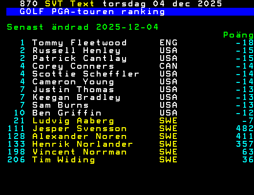 GOLF PGA-touren ranking Senast ändrad 2025-12-04 Poäng 1 Tommy Fleetwood ENG -18 2 Russell Henley USA -15 2 Patrick Cantlay USA -15 4 Corey Conners CAN -14 4 Scottie Scheffler USA -14 4 Cameron Young USA -14 7 Justin Thomas USA -13 7 Keegan Bradley USA -13 7 Sam Burns USA -13 10 Ben Griffin USA -12 21 Ludvig Aaberg SWE -7 111 Jesper Svensson SWE 482 128 Alexander Noren SWE 411 133 Henrik Norlander SWE 357 198 Vincent Norrman SWE 63 206 Tim Widing SWE 36 +Dela 00:06