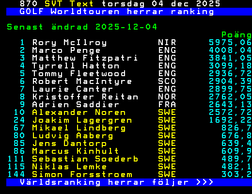 SVT Text Mån 01 Dec. 2025 GOLF Världsranking herrar TEST Senast ändrad 2025-12-01 Poäng 1 Scottie Scheffler USA 17,95 2 Rory McIlroy NIR 9,96 3 Tommy Fleetwood ENG 5,77 4 Xander Schauffele USA 5,72 5 Russell Henley USA 5,29 6 J. J. Spaun USA 4,89 7 Robert MacIntyre SCO 4,87 8 Justin Thomas USA 4,86 9 Ben Griffin USA 4,78 10 Justin Rose ENG 4,25 16 Ludvig Aaberg SWE 3,91 17 Alexander Noren SWE 3,68 111 Joakim Lagergren SWE 1,28 137 Jesper Svensson SWE 1,05 PGA-touren resultat följer >>> +Dela 3 dagar