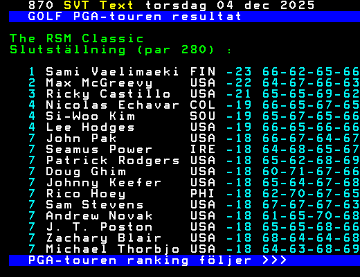 GOLF PGA-touren resultat The RSM Classic Slutställning (par 280) : 1 Sami Vaelimaeki FIN -23 66-62-65-66 2 Max McGreevy USA -22 64-67-66-63 3 Ricky Castillo USA -21 65-65-69-62 4 Nicolas Echavar COL -19 66-65-67-65 4 Si-Woo Kim SOU -19 65-67-65-66 4 Lee Hodges USA -19 66-65-66-66 7 John Pak USA -18 66-67-64-67 7 Seamus Power IRE -18 64-68-65-67 7 Patrick Rodgers USA -18 65-62-68-69 7 Doug Ghim USA -18 60-71-67-66 7 Johnny Keefer USA -18 65-64-67-68 7 Rico Hoey PHI -18 62-70-67-65 7 Sam Stevens USA -18 67-67-67-63 7 Andrew Novak USA -18 61-65-70-68 7 J. T. Poston USA -18 65-65-68-66 7 Zachary Blair USA -18 68-64-64-68 7 Michael Thorbjo USA -18 64-63-68-69 PGA-touren ranking följer >>> +Dela 13:46