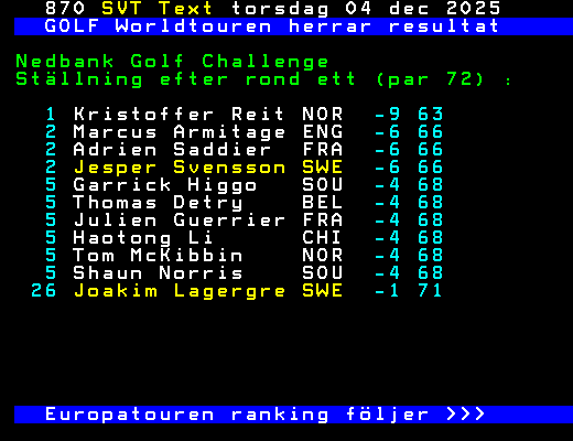 GOLF Worldtouren herrar resultat Nedbank Golf Challenge Ställning efter rond ett (par 72) : 1 Kristoffer Reit NOR -9 63 2 Marcus Armitage ENG -6 66 2 Adrien Saddier FRA -6 66 2 Jesper Svensson SWE -6 66 5 Garrick Higgo SOU -4 68 5 Thomas Detry BEL -4 68 5 Julien Guerrier FRA -4 68 5 Haotong Li CHI -4 68 5 Tom McKibbin NOR -4 68 5 Shaun Norris SOU -4 68 26 Joakim Lagergre SWE -1 71 Europatouren ranking följer >>> +Dela 15:41