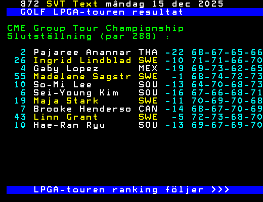 GOLF LPGA-touren resultat CME Group Tour Championship Slutställning (par 288) : 2 Pajaree Anannar THA -22 68-67-65-66 26 Ingrid Lindblad SWE -10 71-71-66-70 4 Gaby Lopez MEX -19 69-73-62-65 55 Madelene Sagstr SWE -1 68-74-72-73 10 So-Mi Lee SOU -13 64-70-68-73 6 Sei-Young Kim SOU -16 67-66-68-71 19 Maja Stark SWE -11 70-69-70-68 7 Brooke Henderso CAN -14 68-67-70-69 43 Linn Grant SWE -5 72-73-68-70 10 Hae-Ran Ryu SOU -13 69-67-69-70 LPGA-touren ranking följer >>> +Dela 129 dagar