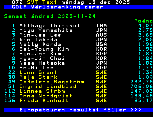 GOLF Världsranking damer Senast ändrad 2025-11-24 Poäng 1 Atthaya Thitikul THA 4,07 2 Miyu Yamashita JPN 2,79 3 Min-Jee Lee AUS 2,69 4 Rio Takeda JPN 2,05 5 Nelly Korda USA 1,96 6 Sei-Young Kim KOR 1,92 7 Hyo-Joo Kim KOR 1,87 8 Hye-Jin Choi KOR 1,84 9 Nasa Hataoka JPN 1,82 10 So-Mi Lee KOR 1,77 22 Linn Grant SWE 1,34 38 Maja Stark SWE 1,00 49 Madelene Sagström SWE 732,75 51 Ingrid Lindblad SWE 706,06 112 Linnea Ström SWE 147,03 114 Anna Nordqvist SWE 138,45 136 Frida Kinhult SWE 85,17 Europatouren resultat följer >>> +Dela 129 dagar