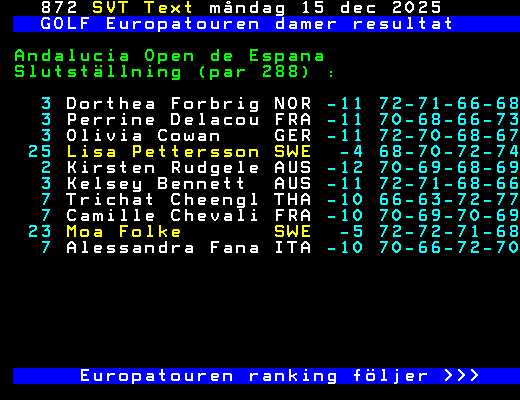 GOLF Europatouren damer resultat Andalucia Open de Espana Slutställning (par 288) : 3 Dorthea Forbrig NOR -11 72-71-66-68 3 Perrine Delacou FRA -11 70-68-66-73 3 Olivia Cowan GER -11 72-70-68-67 25 Lisa Pettersson SWE -4 68-70-72-74 2 Kirsten Rudgele AUS -12 70-69-68-69 3 Kelsey Bennett AUS -11 72-71-68-66 7 Trichat Cheengl THA -10 66-63-72-77 7 Camille Chevali FRA -10 70-69-70-69 23 Moa Folke SWE -5 72-72-71-68 7 Alessandra Fana ITA -10 70-66-72-70 Europatouren ranking följer >>> +Dela 129 dagar