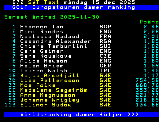 GOLF Europatouren damer ranking Senast ändrad 2025-11-30 Poäng 1 Shannon Tan SGP 2,46 2 Mimi Rhodes ENG 2,28 3 Nastasia Nadaud FRA 2,01 4 Casandra Alexander RSA 1,85 5 Chiara Tamburlini SUI 1,82 6 Cara Gainer ENG 1,68 7 Sara Kouskova CZE 1,66 8 Alice Hewson ENG 1,60 9 Helen Briem GER 1,59 10 Lauren Walsh IRL 1,45 16 Kajsa Arwefjäll SWE 1,17 30 Lisa Pettersson SWE 754,58 33 Moa Folke SWE 668,76 66 Madelene Sagström SWE 353,26 92 Anna Magnusson SWE 221,77 93 Johanna Wrigley SWE 216,69 113 Ellinor Sudow SWE 134,68 Världsranking damer följer >>> +Dela 129 dagar