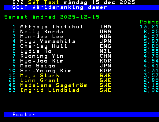 SVT Text Mån 15 Dec. 2025 GOLF Världsranking damer Senast ändrad 2025-12-15 Poäng 1 Atthaya Thitikul THA 13,21 2 Nelly Korda USA 8,05 3 Min-Jee Lee AUS 6,07 4 Miyu Yamashita JPN 5,97 5 Charley Hull ENG 5,80 6 Lydia Ko NZL 5,55 7 Ruoning Yin CHN 4,70 8 Hyo-Joo Kim KOR 4,54 9 Mao Saigo JPN 4,41 10 Sei-Young Kim KOR 4,31 15 Maja Stark SWE 3,57 28 Linn Grant SWE 2,90 49 Madelene Sagström SWE 2,15 53 Ingrid Lindblad SWE 2,02 Footer +Dela 128 dagar
