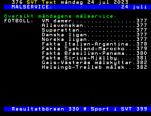 SVT Text Mån 24 Juli 2023 MÅLSERVICE: 24 juli Översikt måndagens målservice: FOTBOLL: VM damer.................377 Allsvenskan..............377 Superettan...............377 Danska ligan.............377 Norska ligan.............377 Fakta Italien-Argentina..378 Fakta Tyskland-Marocko...379 Fakta Brasilien-Panama...380 Fakta Sirius-Mjällby.....381 Gais-Västerås målskyttar.382 Helsingb-Trelleb målsk...382 Resultatbörsen 330 * Sport i SVT 399 +Dela 875 dagar
