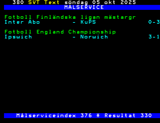 SVT Text Sön 05 Okt. 2025 MÅLSERVICE Fotboll Finländska ligan mästargr Inter Åbo - KuPS 0-3 Fotboll England Championship Ipswich - Norwich 3-1 Målserviceindex 376 * Resultat 330 +Dela 199 dagar